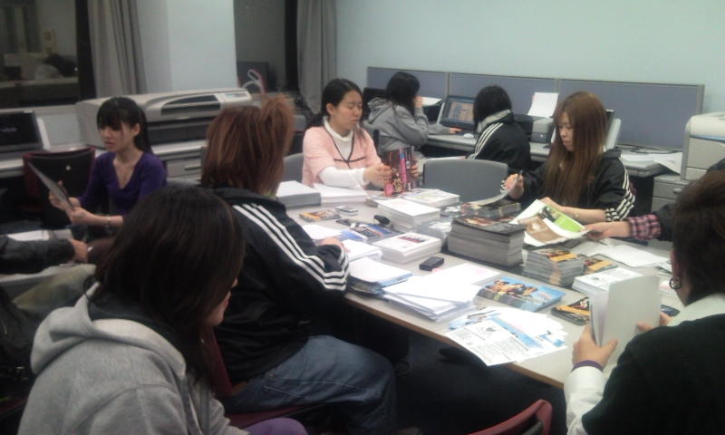 。ここ1週間の制作コ−スの学生達の頑張りは目を見張るものがありましたね☆そんな制作の学生達は今現在も作業の真っ最中!!明日は機材の積み込みがあるので、それまでにフライヤーの折込作業を終わらせねばならず、担当者が必死で頑張っております