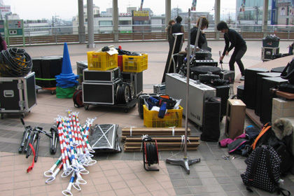 当初は簡単なセットで考えていたのですが、多くのお客様が見込まれること、今後PV等に収録されるかも……との事でホールライヴに匹敵する規模の機材を学校から持ち込みました!また、一般の方が通行される場所とあって、警察との協議を含め『絶対に事故が無いように』万全の体制を敷きました。