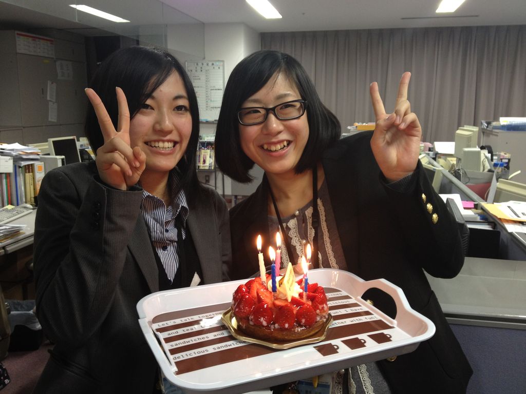このお二人は、コンサート・イベント科の卒業生。誕生日が1日違い、という事で職員室にてサプライズのバースデー