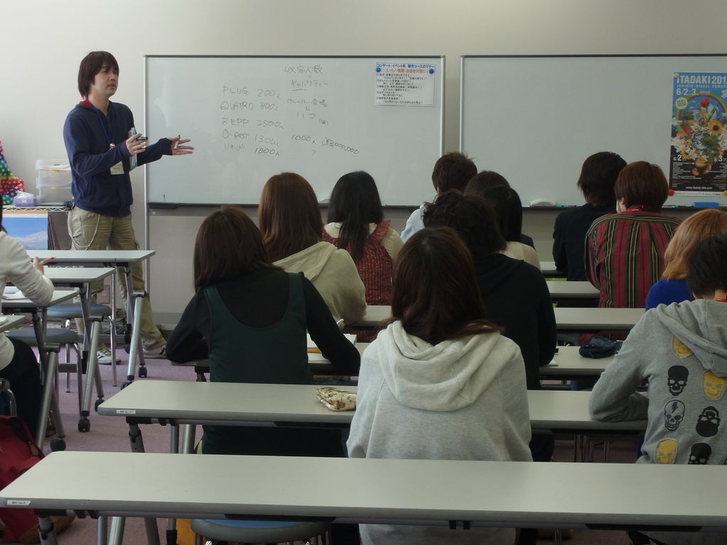 そして、もう一人お招きしている講師の沼部さんからは、ライブを制作する時の準備期間から本番終了後までの流れを、実際に開催されているライブを例に挙げて説明していただきました!沼部さんはフジロックを始め多くのロックフェスやアーティスト主催の企画ライブなど、数多くのライブを手がけている方です。そんな方から聞くお話は貴重なものばかり!