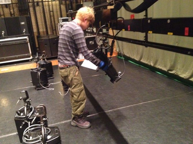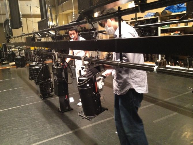 まず、コンサート照明コースでは、 指定された灯体を指定された場所に安全に吊りこめるかどうかテストしました。種類がたくさんある機材の中から正しいものを選ぶのに苦戦しながらも、最終的にはみんな綺麗に灯体を吊りこむことができました!
