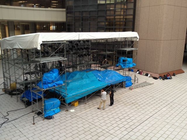 そして、最後は雨対策としてステージ上にブルーシートをかぶせて、本日の作業は終了しました。