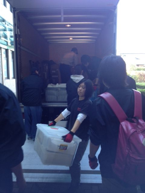 当日は、学校でトラックに機材を積み込み、町田工業高校へ機材を運搬、会場に到着した機材をトラックから降ろしていきます。