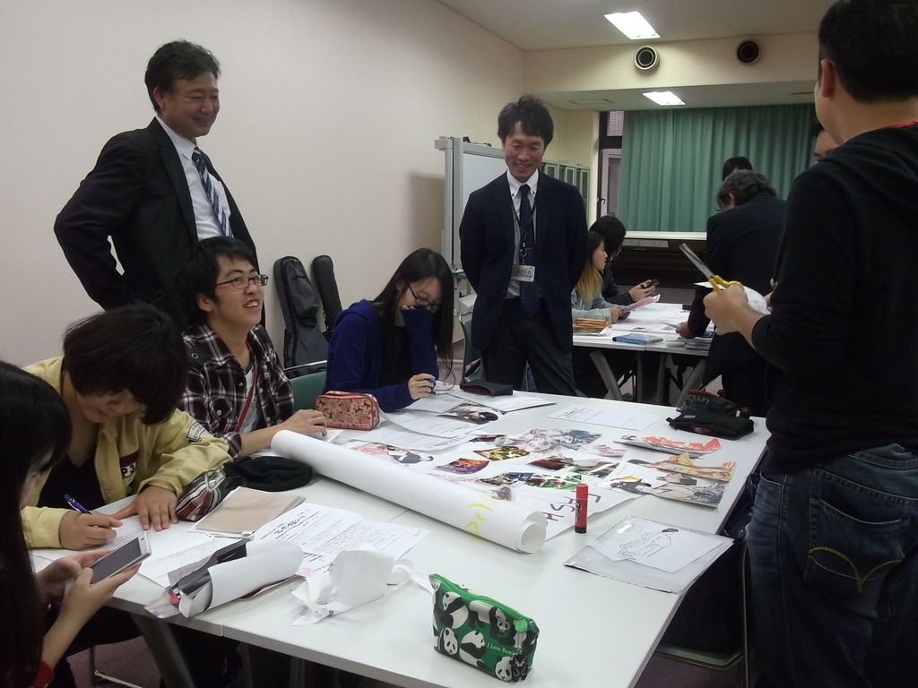 千葉学校長は、参加学生のみなさんがプレゼンしたい言葉の内容を英語翻訳したりする様子や、模造紙に写真やメッセージを貼りの作業の様子をご覧頂き、「もっとこうしたら分かりやすいですね」や、「これがあった方がインパクトがあるかもよ」などアドバイスを優しい声でかけてくださいました。
