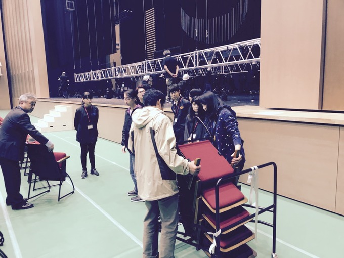 ただ椅子を積むのではなく、椅子を積む向き、決められているカートに入れる椅子の個数をチェックしながら順次片付けていきます。これは、制作コースがお客様の座席を管理するので、制作コースが仕切って進めました。