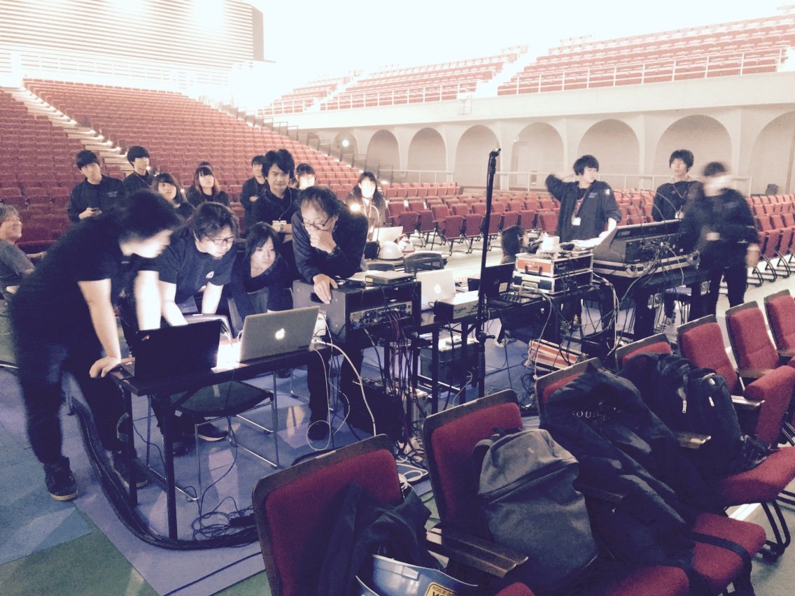 PA、照明、舞台チームが機材をステージ前に集めるため、座席を撤去している写真です。